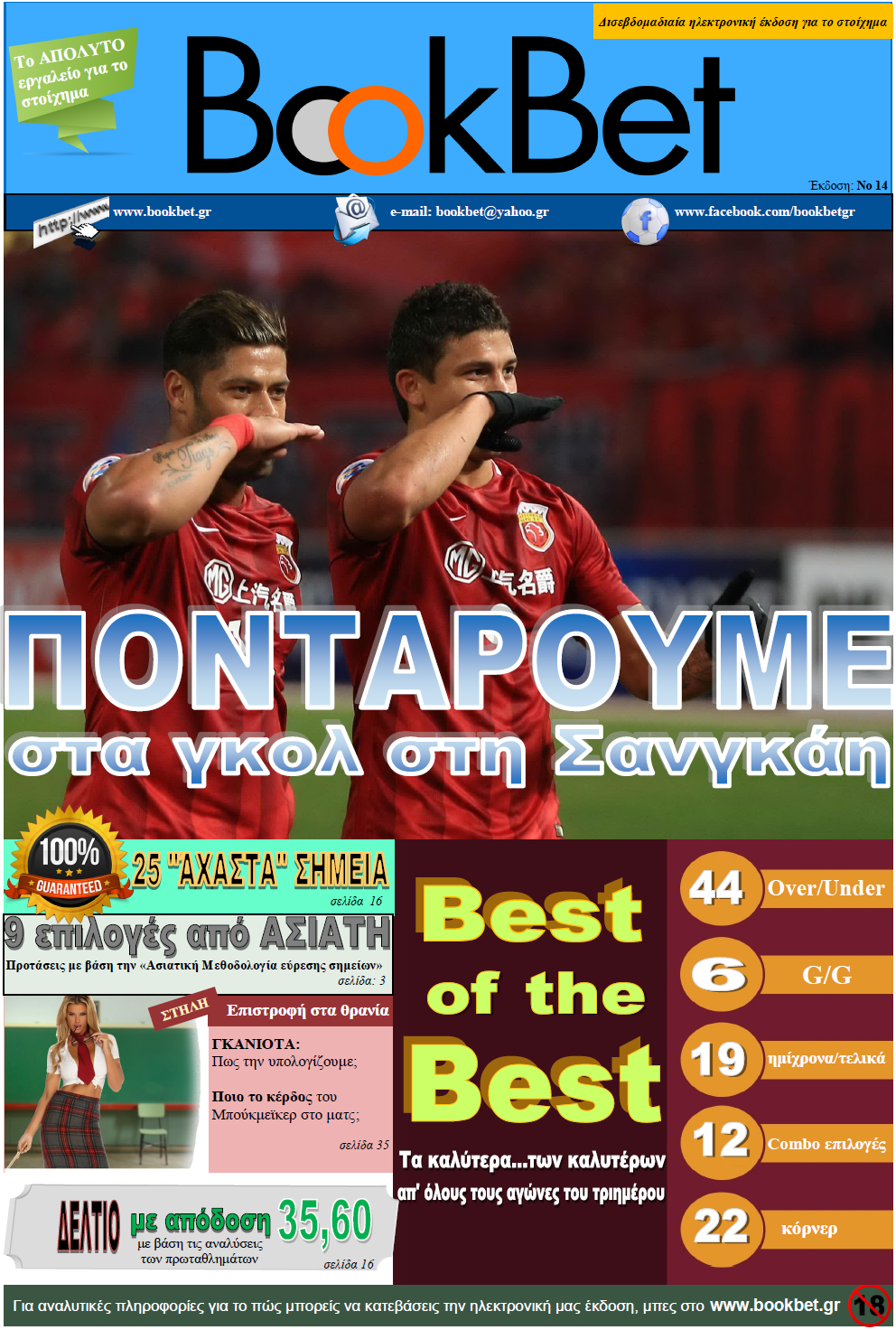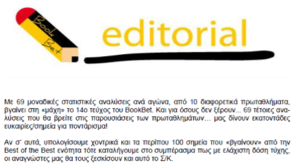 Με 69 μοναδικές στατιστικές αναλύσεις ανά αγώνα, από 10 διαφορετικά πρωταθλήματα, βγαίνει στη «μάχη» το 14ο τεύχος του BookBet. Και για όσους δεν ξέρουν… 69 τέτοιες αναλύσεις που θα βρείτε στις παρουσιάσεις των πρωταθλημάτων… μας δίνουν εκατοντάδες ευκαιρίες/σημεία για ποντάρισμα!