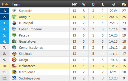 Μετά το πέρας 13 αγωνιστικών, η – Πρωταθλήτρια Απερτούρα – Αντίγκουα, βρίσκεται στη 2η θέση της βαθμολογίας, στο -2 από τη Σαναράτε.